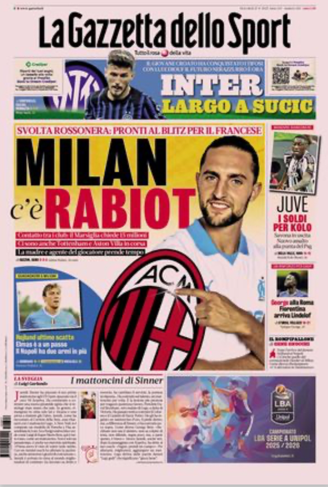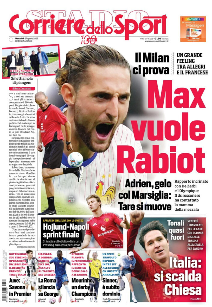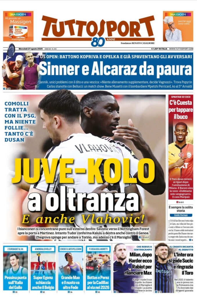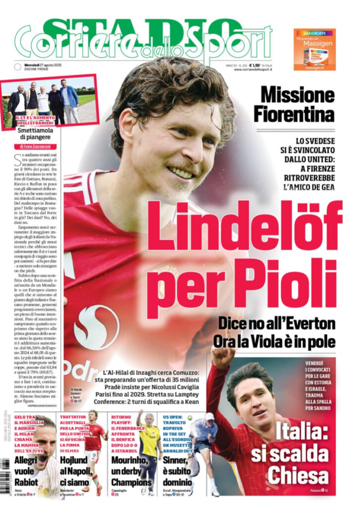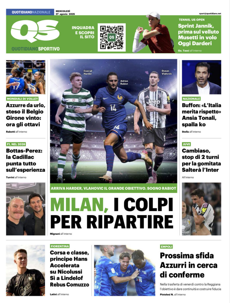 Queste le prime pagine di Qs, CorFio, Gazzetta, CorSport, Stadio e Tuttosport in edicola questa mattina, mercoledì 27 agosto 2025