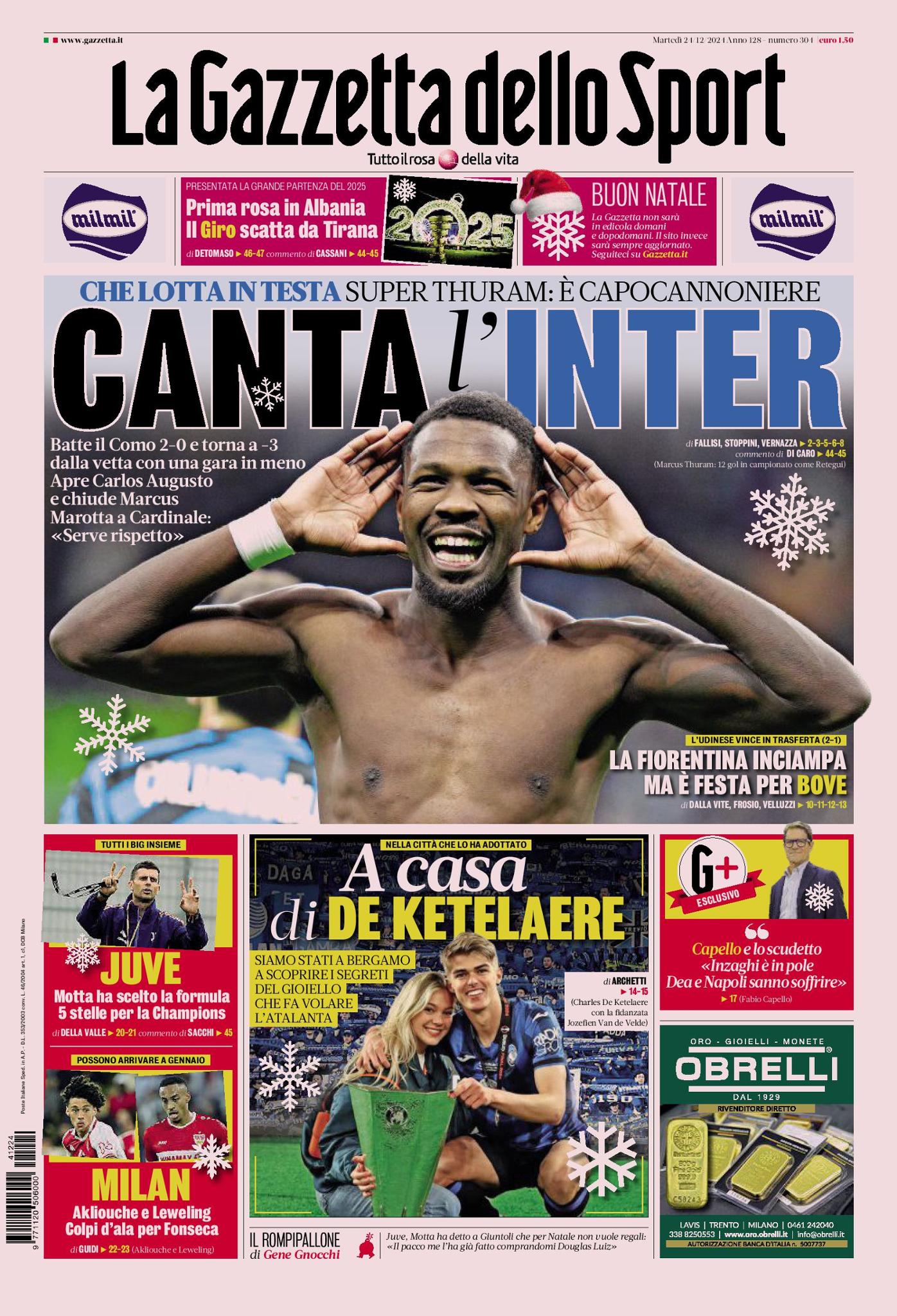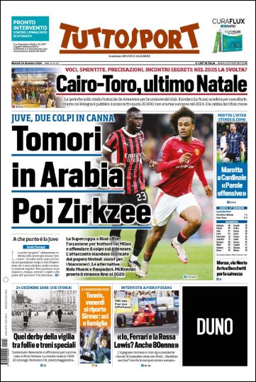 Queste le prime pagine di Qs, Gazzetta, CorSport, Stadio e Tuttosport in edicola questa mattina, martedì 24 dicembre 2024