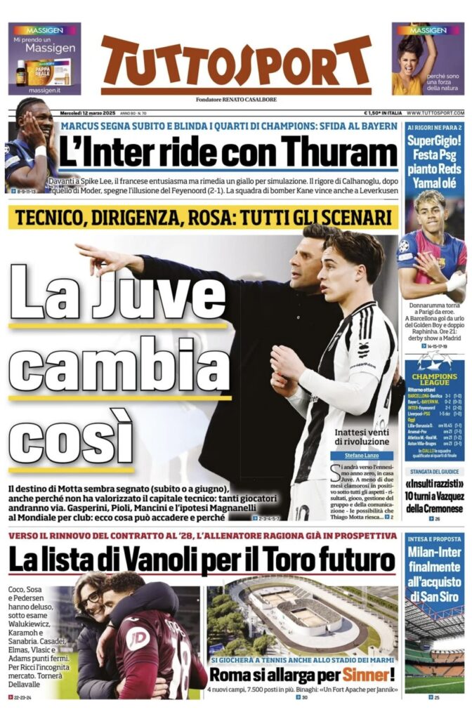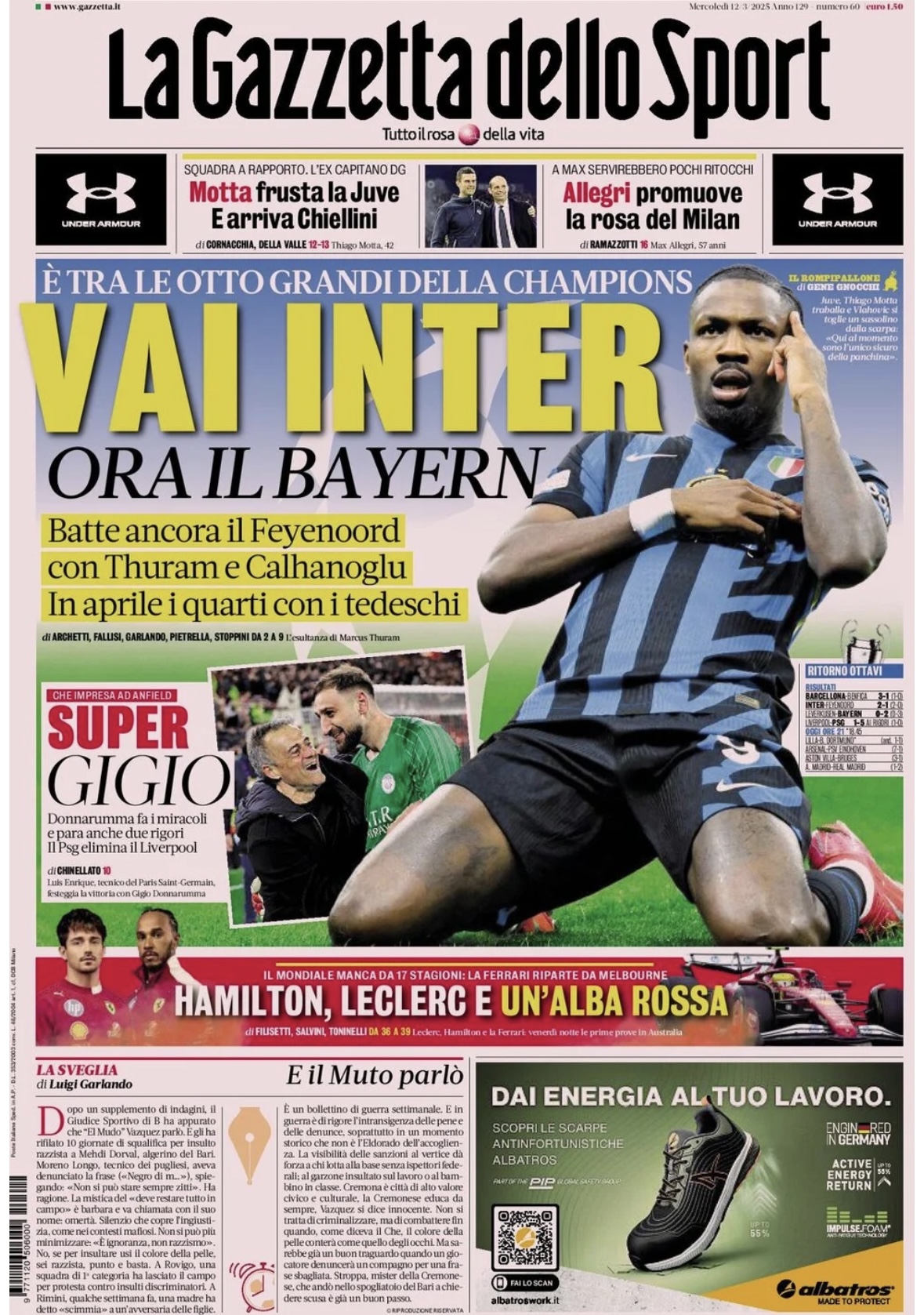 Queste le prime pagine di QS, Gazzetta, CorSport, Stadio e Tuttosport in edicola questa mattina, mercoledì 12 marzo 2025