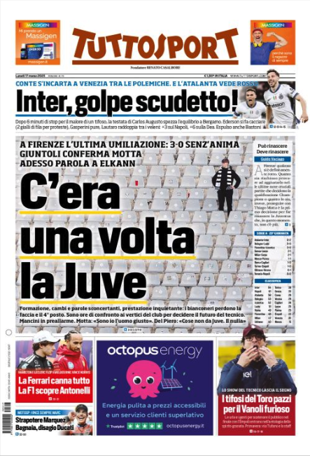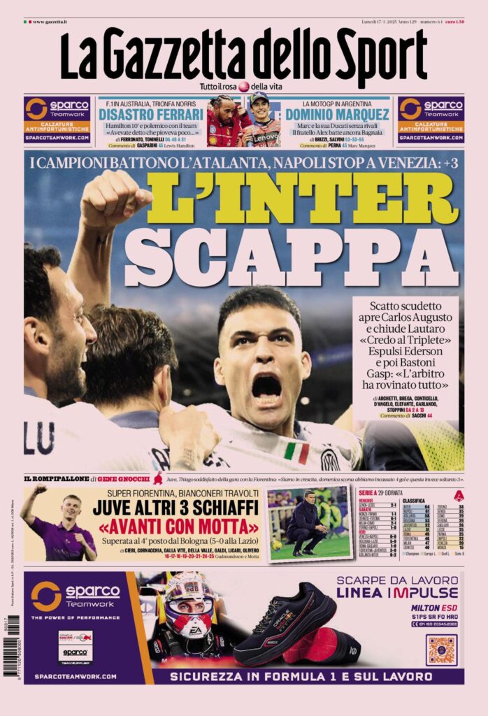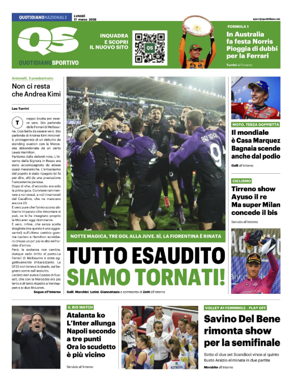 Queste le prime pagine di QS, Gazzetta, CorSport, Stadio, Corriere Fiorentino e Tuttosport in edicola questa mattina, lunedì 17 marzo 2025