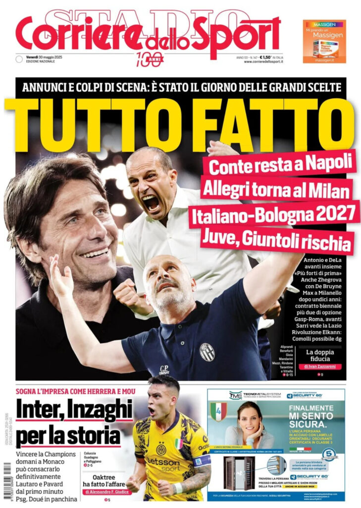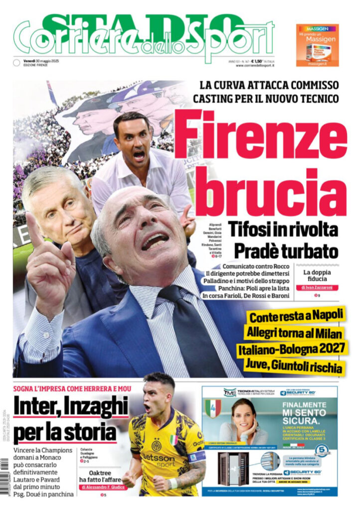 Queste le prime pagine di Qs, Gazzetta, CorSport, Stadio e Tuttosport in edicola questa mattina, venerdì 30 maggio 2025