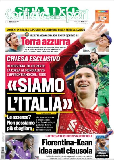 Queste le prime pagine di Qs, Gazzetta, CorSport, Stadio e Tuttosport in edicola questa mattina, venerdì 6 giugno 2025
