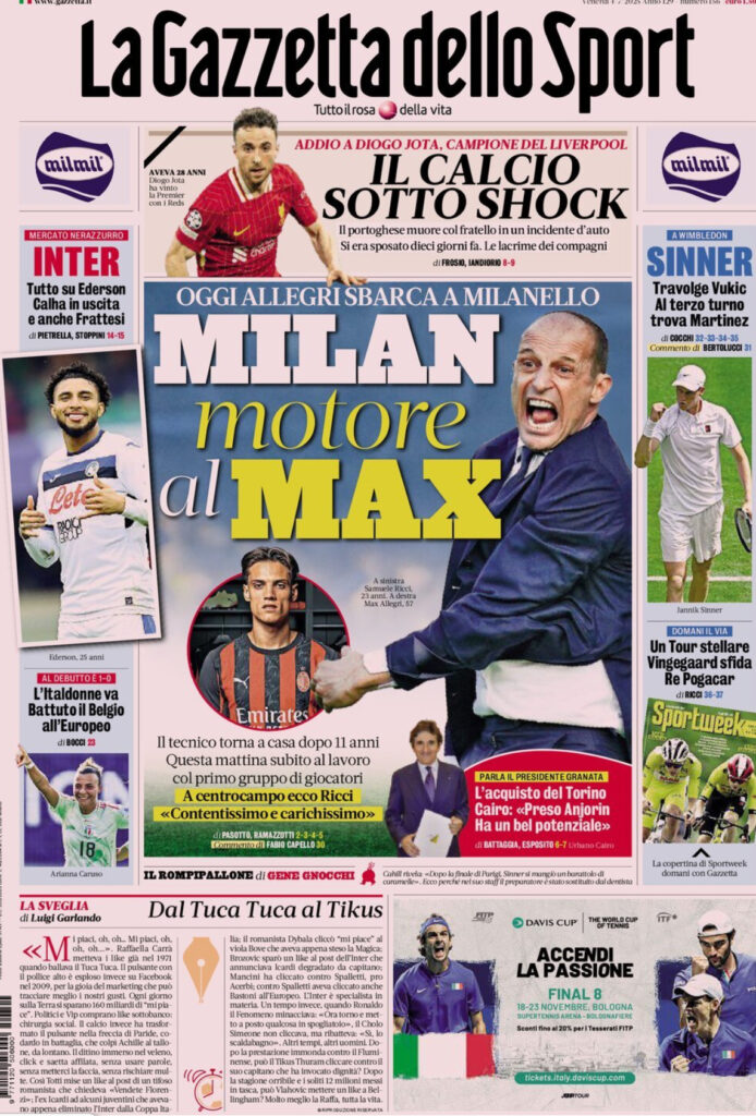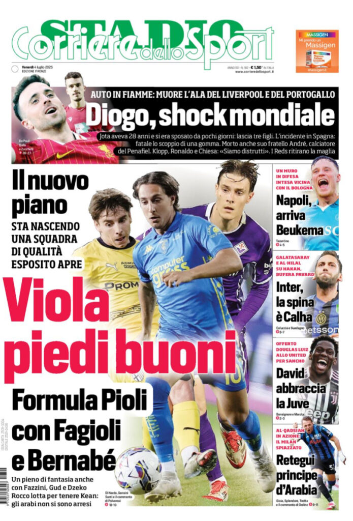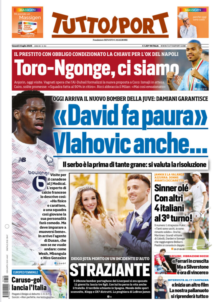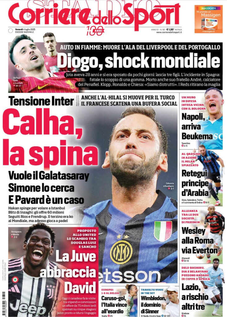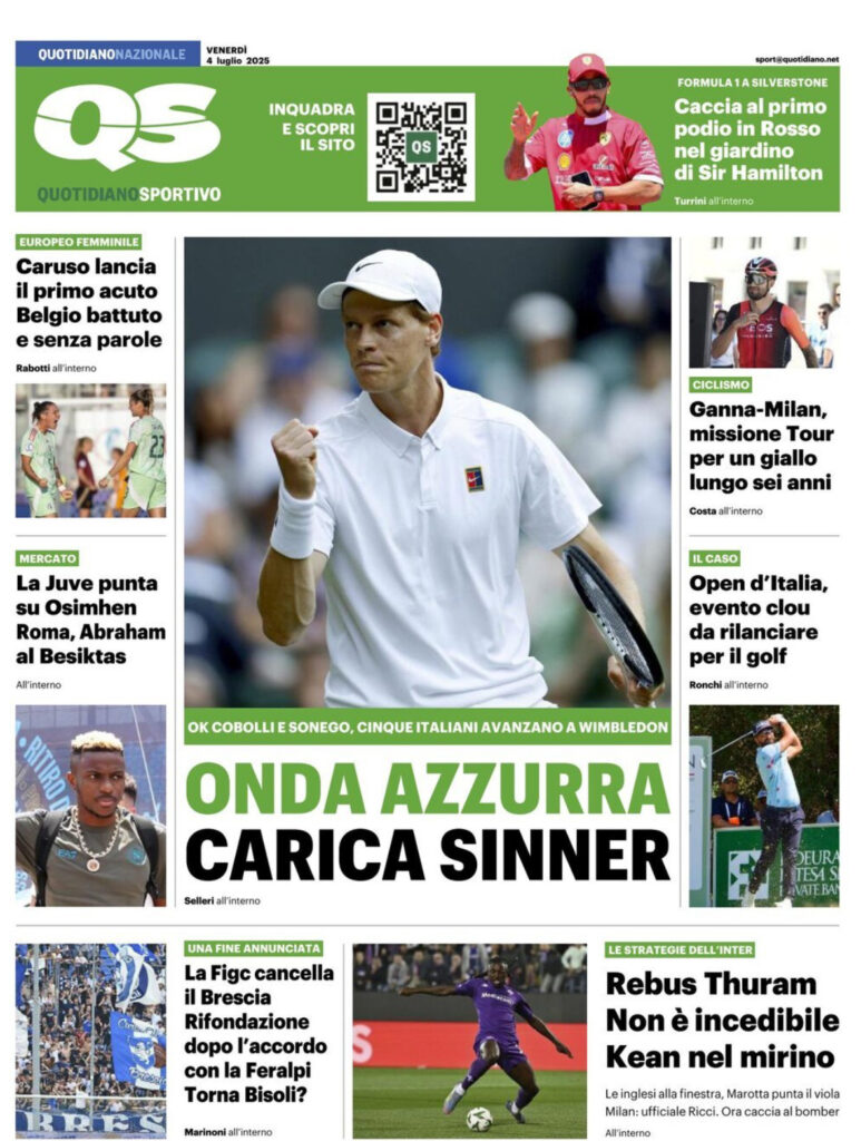 Queste le prime pagine di Qs, Gazzetta, CorSport, Stadio e Tuttosport in edicola questa mattina, venerdì 4 luglio 2025