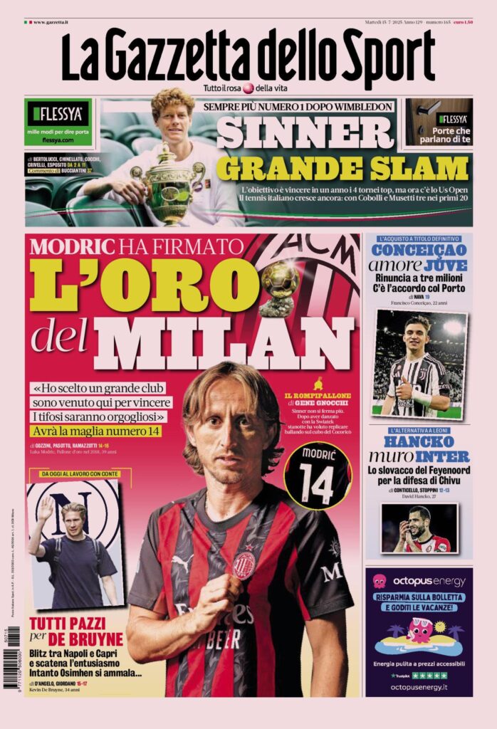 Queste le prime pagine di Qs, Gazzetta, CorSport, Stadio e Tuttosport in edicola questa mattina, martedì 15 luglio 2025