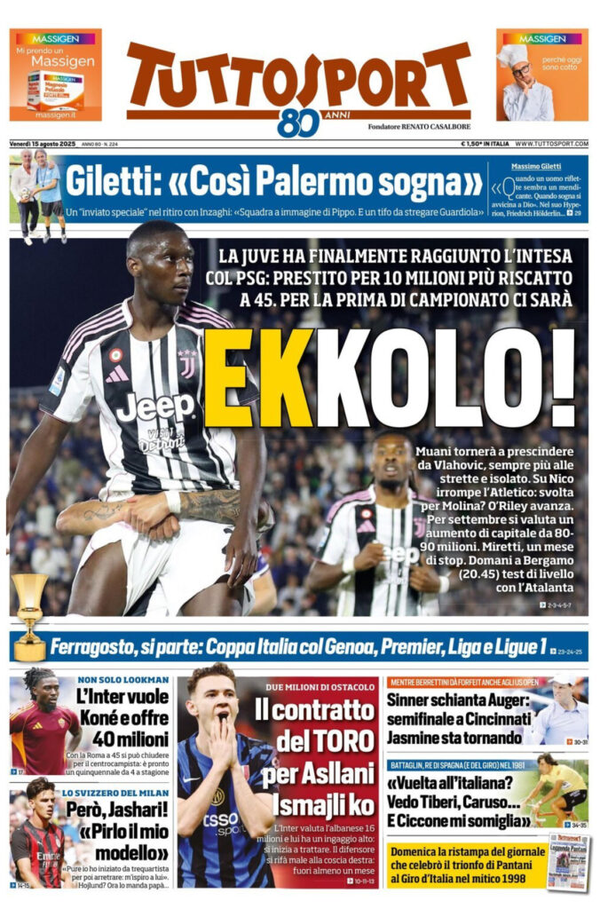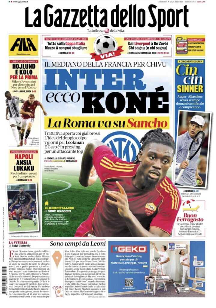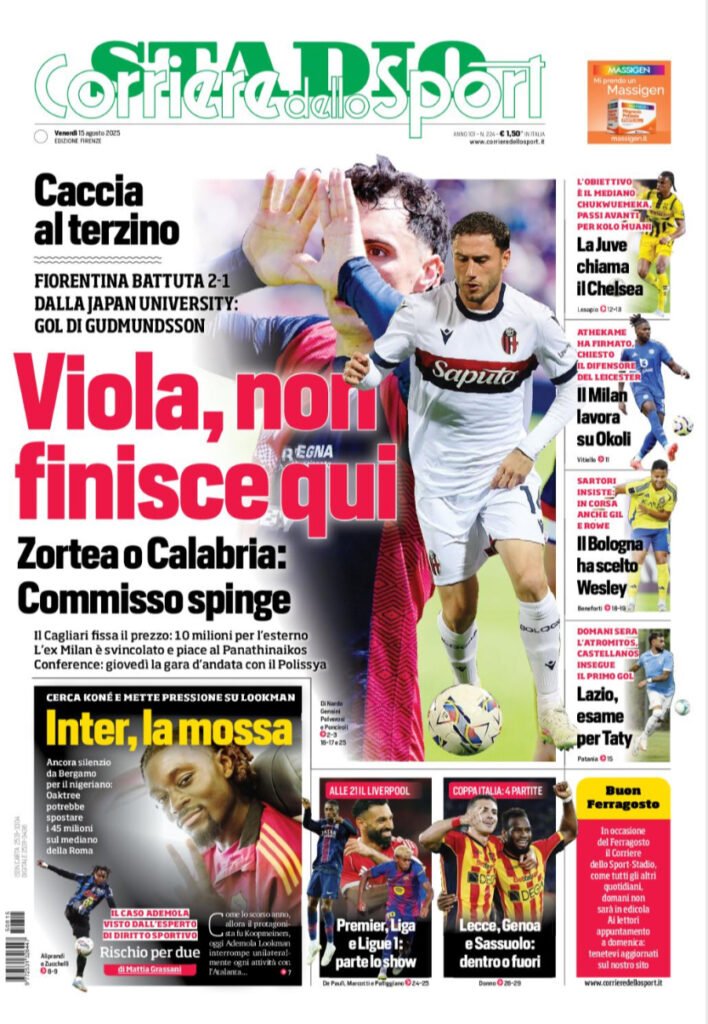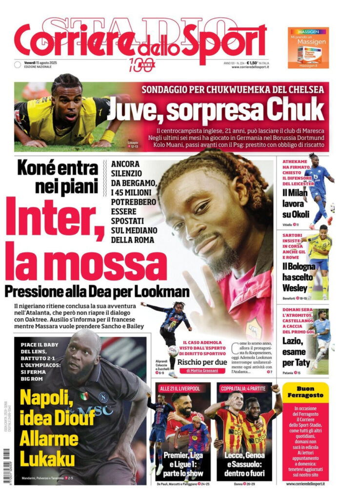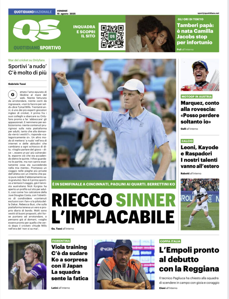 Queste le prime pagine di Qs, Gazzetta, CorSport, Stadio e Tuttosport in edicola questa mattina, venerdì 15 agosto 2025