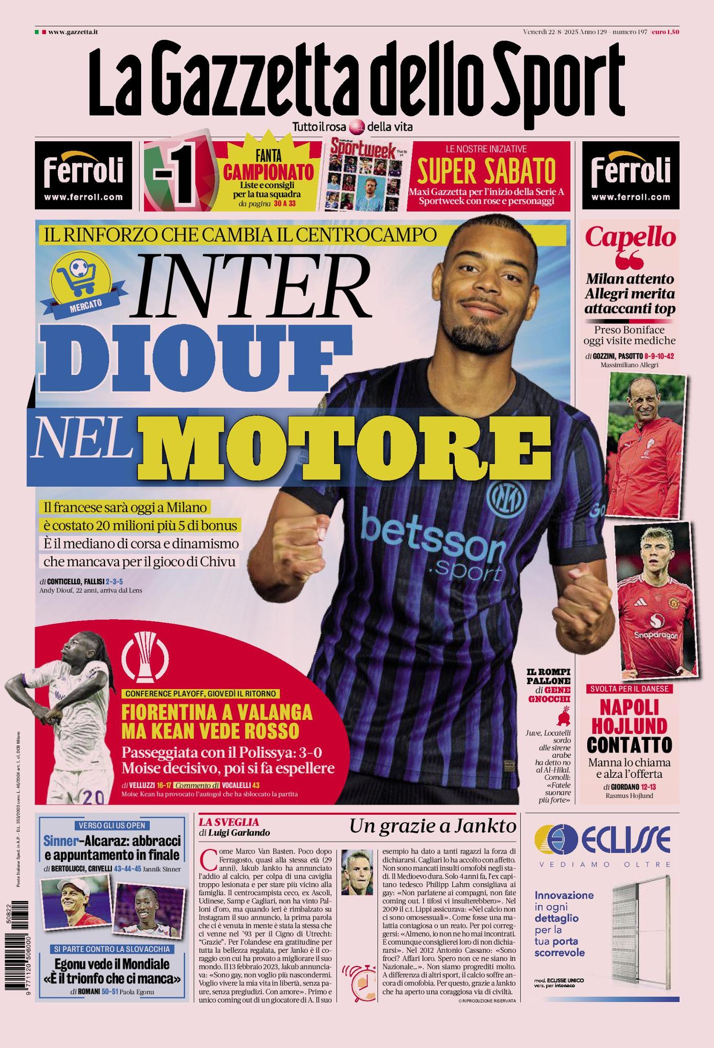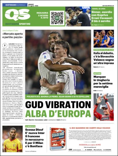 Quotidiani: le prime pagine di Qs, Gazzetta, CorSport, Stadio e Tuttosport in edicola questa mattina, venerdì 22 agosto 2025
