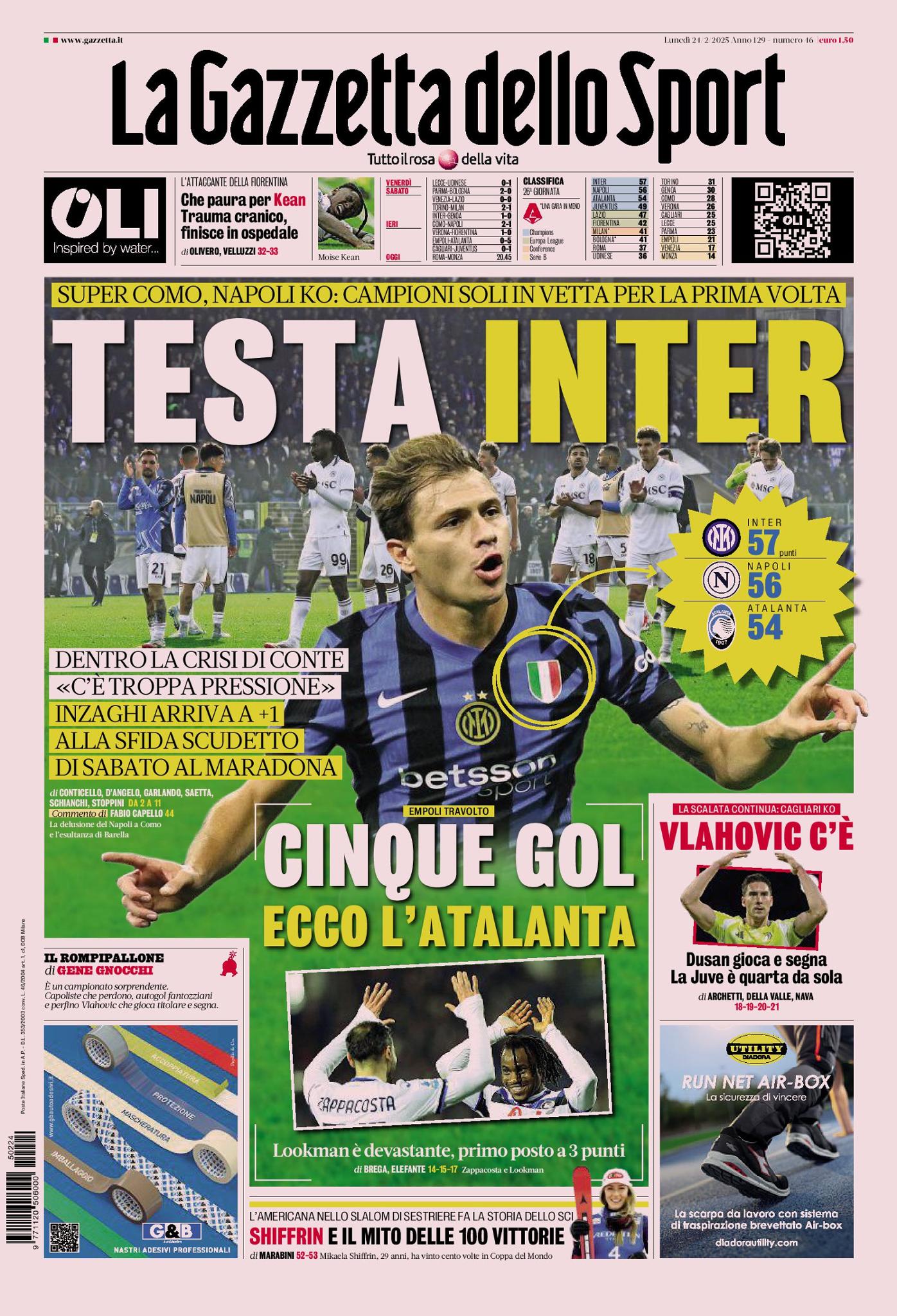 Queste le prime pagine di Qs, Gazzetta, CorSport, Stadio, Tuttosport e CorFio in edicola questa mattina, lunedì 24 febbraio 2025