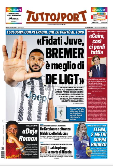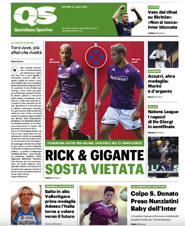 Queste le prime pagine di Qs, Gazzetta, CorSport, Stadio e Tuttosport in edicola questa mattina, giovedì 21 luglio 2022