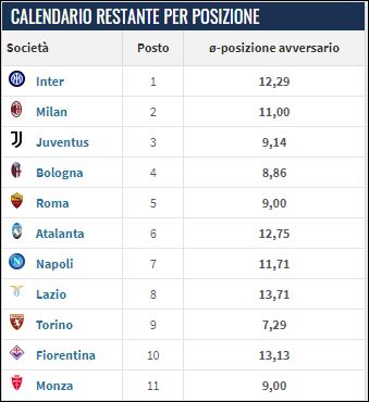 Calendario sulla carta più complicato per il Torino (media 7,29), il Bologna (8,86), la Roma e il Monza (entrambe 9). In coda Sassuolo, Cagliari e Verona sfideranno invece più squadre di alta classifica rispetto a Lecce, Udinese e Frosinone.