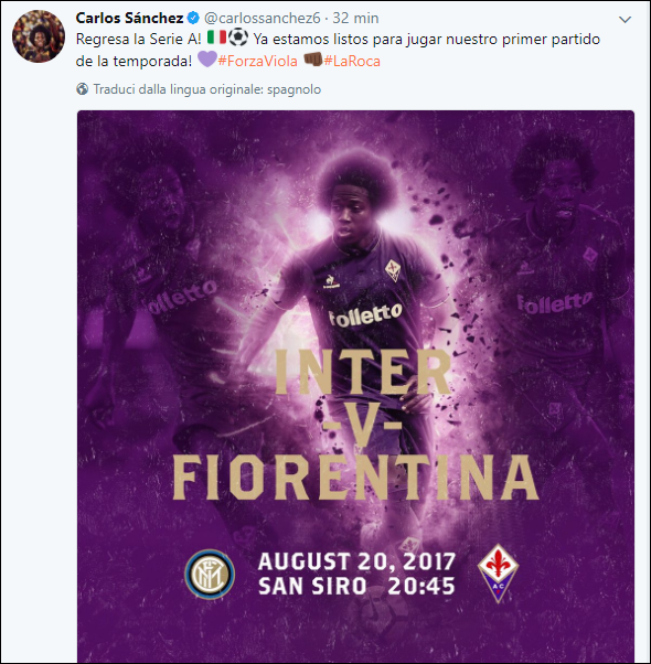 “Torna la Serie A! Siamo pronti a giocare la nostra prima partita della stagione! ?#ForzaViola ??#LaRoca”. Scrive così su Twitter Carlos Sanchez. Il colombiano tornerà a giocare a centrocampo, dopo un’annata passata in difesa: vedremo se partirà dal primo minuto a San Siro.