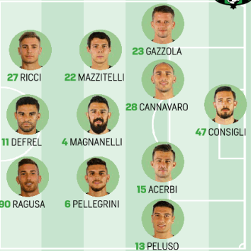Diverse assenze per Di Francesco stasera al Franchi. 4-3-3 per il tecnico neroverde, con davanti Defrel, Ricci e Ragusa. In mezzo al campo Magnanelli, Pellegrini e Mazzitelli. Difesa affidata a Gazzola, Cannavaro, Acerbi, Peluso e Consigli tra i pali.