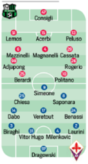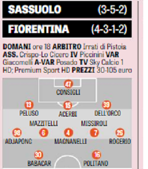 Potrebbe esser costretto a saltare la prima sfida da ex contro la sua Fiorentina Khouma Babacar. L’ex viola, domani, potrebbe partire infatti dalla panchina. Davanti Berardi e Politano nel 3-5-2 che disegna per i neroverdi il Corriere Dello Sport, con le assenze di Goldaniga, Sensi e Lirola. In porta Consigli, dietro Lemos, Acerbi e Peluso. In mediana Mazzitelli, Magnanelli e Cassata con sulle corsie Adjapong e Rogerio.