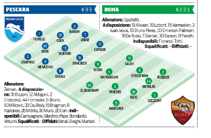 Chiude la giornata di Serie A la gara dell’Adriatico tra Pescara e Roma. Queste le probabili formazioni di Zeman e Spalletti in campo alle 20.45, secondo il Corriere Dello Sport:
