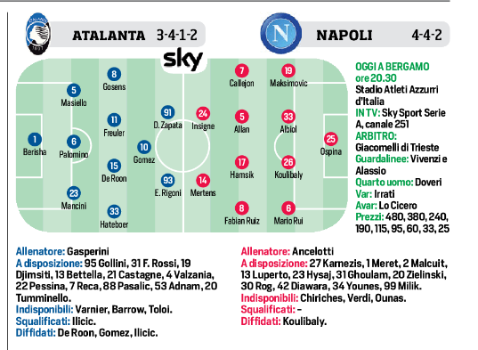 Posticipo di lusso a Bergamo. In campo Atalanta-Napoli alle 20.30, gara che chiuderà la 14° giornata di campionato. La squadra di Ancelotti in caso di mancata vittoria verrebbe agganciata dall’Inter al secondo posto. La squadra di Gasperini ha gli stessi punti di quella di Pioli, 18. Le probabili formazioni, con ancora l’ex viola Mancini titolare: