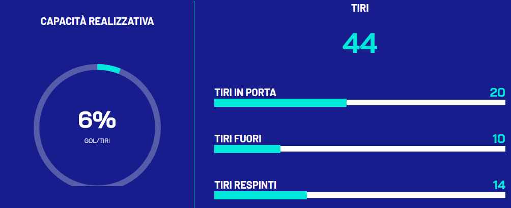 DAVANTI E DIETRO. Considerando solamente le gare di Serie A, la squadra viola è partita con una capacità realizzativa da zona retrocessione, ovvero col 6%. Ha messo a referto 44 conclusioni, segnando solamente 3 reti.