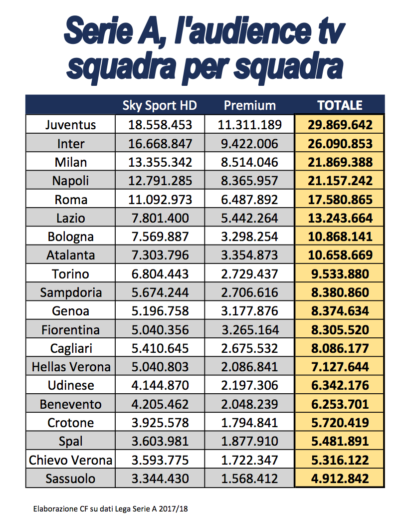 Qual è, ad oggi, la situazione dell’audience televisiva per le squadre italiane in Serie A? In testa, ovviamente, ci sono le big, con la Fiorentina che scende fino al 12° posto, superata anche da squadre come Bologna, Atalanta, Torino, Sampdoria e Genoa.