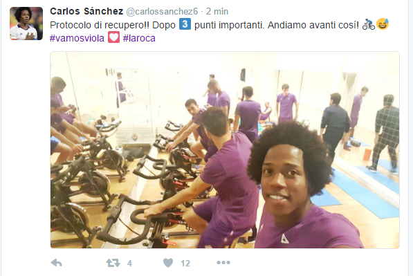“Protocolo di recupero!! Dopo 3️⃣ punti importanti. Andiamo avanti cosí! ??? #vamosviola ? #laroca”. Così scrive via Twitter Carlos Sanchez, tornato...