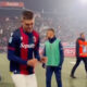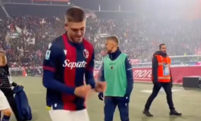 Il terzino rossoblù si è esibito sotto la propria curva con il Griddy, il balletto di Moise Kean Dopo la vittoria...