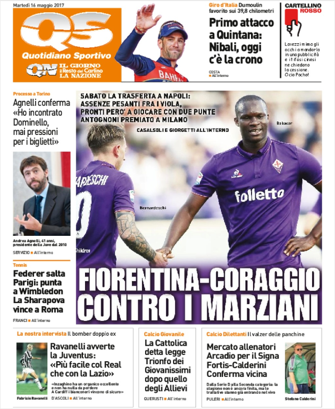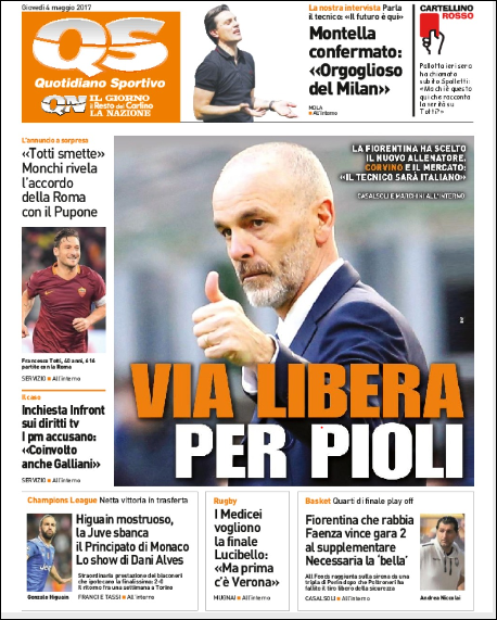 News/ 7:45Quotidiani: la prima pagina di Qs, Stadio, Gazzetta, Corriere dello Sport, TuttosportQueste le prime pagine dei quotidiani di Corriere dello Sport, Corriere dello Sport Stadio, Qs-La Nazione, Tuttosport e Gazzetta dello Sport in edicola questa mattina: