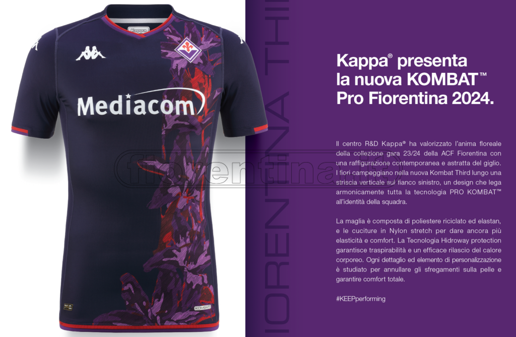 Ufficiale la terza maglia della Fiorentina per la stagione 2023-24. Come annuncia il club viola, il centro R&D Kappa ha valorizzato l’anima floreale della collezione gara 23/24 con una raffigurazione contemporanea e astratta. La grafica riprende dei gigli stilizzati, disegnati in rosso e gradazioni di viola, e forma una striscia verticale su tutto il fianco sinistro della maglia.