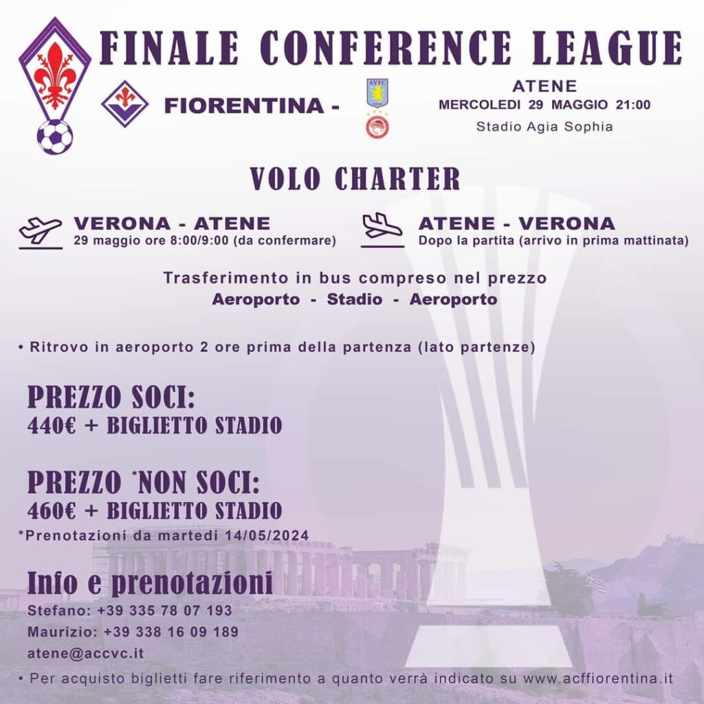 Saranno quelli più gettonati, per una questione logistica e di prezzo. I voli charter organizzati dalle associazioni dei tifosi stanno prendendo vita. Nelle ultime ore l’Associazione Centro Coordinamento Viola Club ha comunicato i dettagli del primo. Partenza da Verona, rientro dopo la partita. Costo che oscilla tra i 440 euro e i 460 per i non soci.