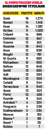 STAKANOVISTI. Dodo è l’esempio più evidente: 1273 minuti in stagione, 12 su 12 da titolare in A. Se limitiamo i dati al campionato, la rosa viola è divisa ancor più nettamente in due scaglioni: Dodo, Ranieri, Kean, Gosens, Colpani, Comuzzo, Bove, De Gea da una parte (tutti con più di 800′ in Serie A). Dopo di loro, tutti gli altri hanno meno di 500′ nelle gambe.
