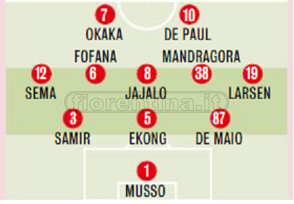 Dovrebbe arrivare al Franchi senza Becao l’Udinese di Igor Tudor, ma con De Paul che rientra dalla squalifica. Sarà 3-5-2 per i bianconeri a Firenze. Davanti coppia De Paul-Okaka. In mediana Mandragora, Jajalo e Fofana nel mezzo, Sema e Stryger Larsen sulle corsie. Dietro l’ex De Maio assieme e Ekong e Samir. In porta Musso.
