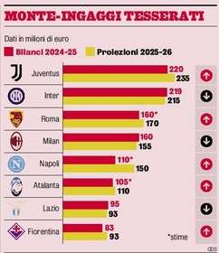 Tutto considerato, nel 2025-26 gli stipendi dei tesserati viola dovrebbero aumentare di circa 10 milioni, da 83 a 93 milioni, in base alle stime della Gazzetta (senza considerare l’effetto dell’esonero di Pioli e dell’avvicendamento con un nuovo tecnico). In tal modo la Fiorentina aggancerebbe la Lazio al settimo posto, nella classifica dei monte-ingaggi. Viola tra le big, come potenza di fuoco, grazie agli apporti della proprietà, che anche nel 2025-26 ha confermato la sponsorizzazione di Mediacom da 25 milioni toccando il mezzo miliardo di risorse investite. Sul campo è andato in scena un altro film.