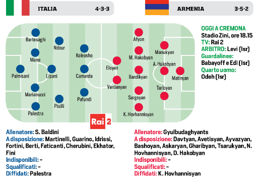 Le probabili formazioni per l’Italia Under 21 di Baldini che oggi sfida l’Armenia. Dal 1′ ancora Cher Ndour
