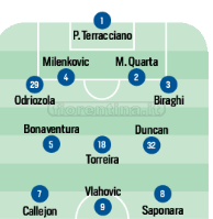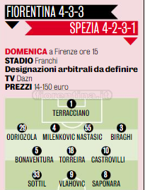 Sono diverse le previsioni di formazione per quanto riguarda la Fiorentina, in vista della gara con lo Spezia di domenica. Al netto del difficile (quasi impossibile) recupero di Gonzalez, positivo al Covid-19, davanti è già dubbio Callejon-Sottil-Saponara. I tre, come a Roma, si giocano due maglie. Per il Corriere Dello Sport è in vantaggio ancora lo spagnolo, ma con Saponara al posto di Sottil. Per la Gazzetta Dello Sport, invece, toccherà agli altri due giocare assieme a Vlahovic. Dubbi anche in altri ruoli. Per la rosea, ad esempio, potrebbe essere schierato Nastasic al posto di Quarta in difesa, con Odriozola in vantaggio per prendere il posto di Venuti a destra. In mediana, inoltre, sarà lotta a due tra Duncan e Castrovilli.