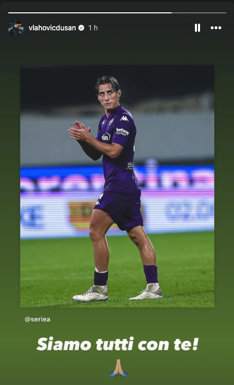 Dusan Vlahovic, attaccante serbo della Juventus ed ex giocatore della Fiorentina, ha espresso solidarietà a Edoardo Bove, colpito da un malore durante Fiorentina–Inter. Con un semplice ma sentito messaggio, “Siamo tutti con te”, Vlahovic si è unito al coro di supporto per il giovane calciatore.