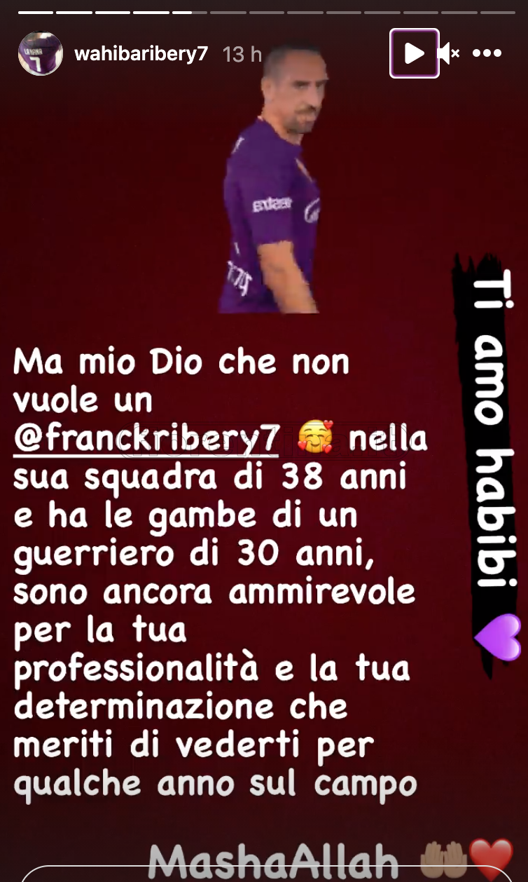 “Ma mio Dio, chi non vuole nella sua squadra un Ribery di 38 anni che ha però le gambe di un guerriero di 30? Sono ancora ammirata per la tua professionalità e la tua determinazione, meriti di vederti per qualche anno sul campo”. Questo il messaggio di Wahiba per il suo Franck.